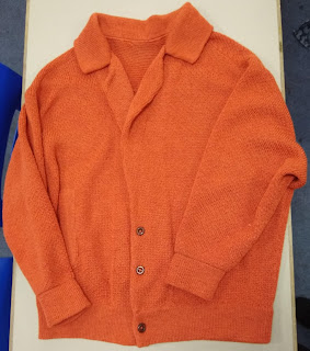 Sally machine knit a terracotta jacket/cardigan in one-way tuck-stitch double-bed rib (Nina Miklin pattern K12).